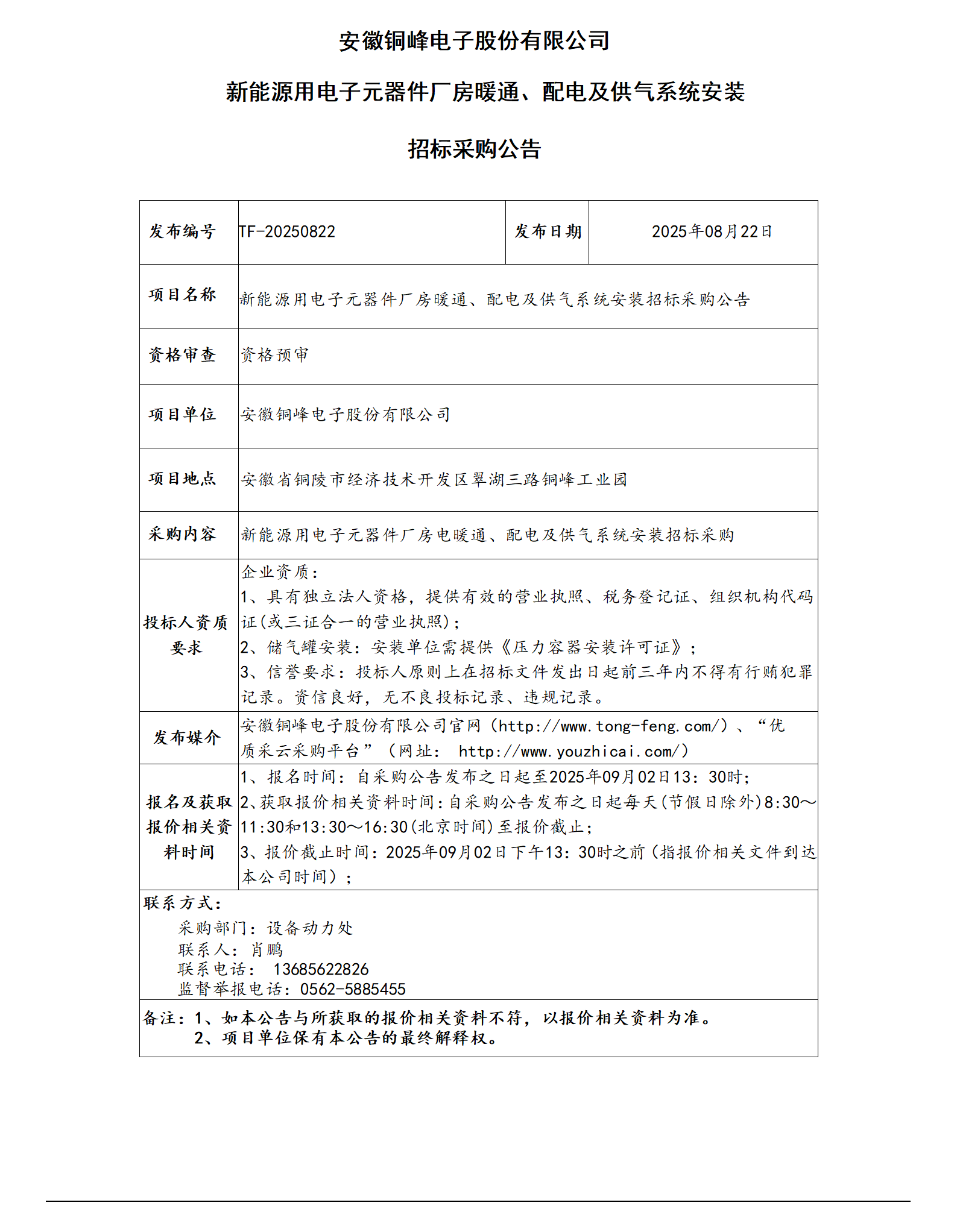 安徽銅峰電子股份有限公司 (新能源用電子元器件廠房凈化工程 招標(biāo)公告)_01