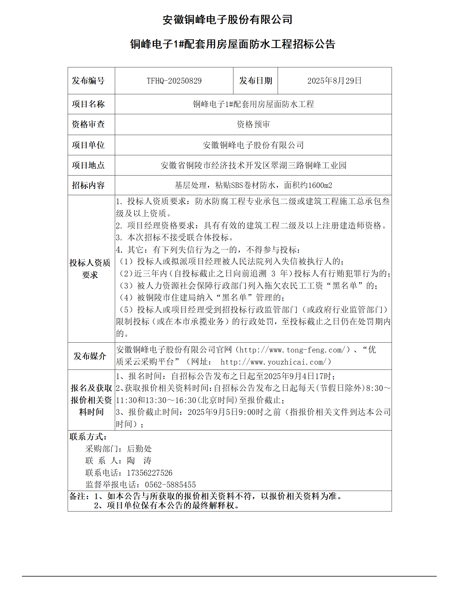 安徽銅峰電子股份有限公司 (銅峰電子1#配套用房屋面防水工程 招標公告)_01