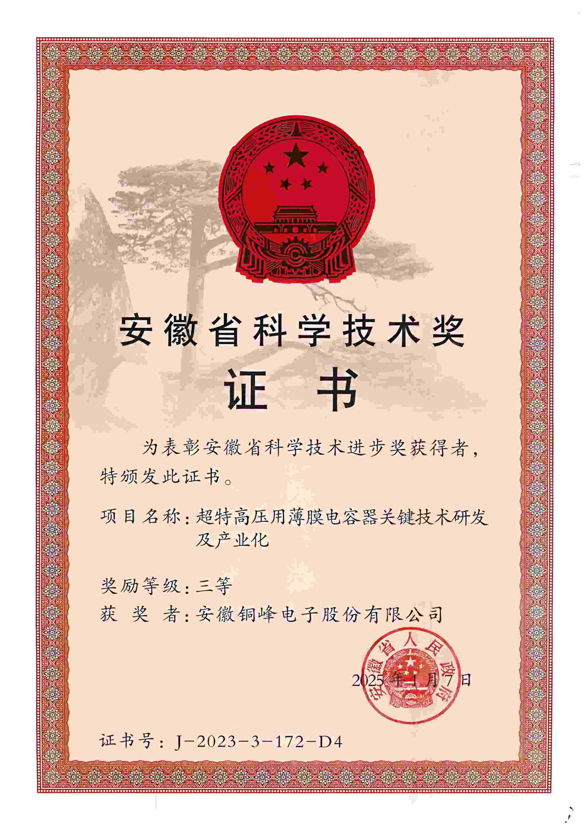 5月12日上午,安徽省科技創(chuàng)新大會召開,隆重表彰2023年度安徽省科學(xué)技術(shù)獎勵(lì)獲獎人員和組織。公司與國網(wǎng)安徽省電力有限公司、國網(wǎng)智能電網(wǎng)研究院有限公司、西安交通大學(xué)等單位聯(lián)合完成的“超特高壓用薄膜電容器關(guān)鍵技術(shù)研發(fā)及產(chǎn)業(yè)化項(xiàng)目”榮獲安徽省科技進(jìn)步三等獎。