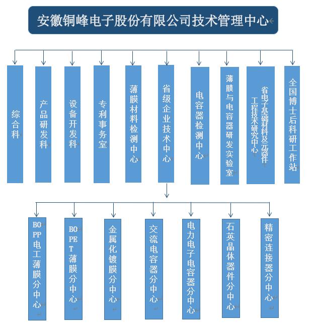 銅峰公司為國家高新技術(shù)企業(yè)、國家火炬計劃重點(diǎn)高新技術(shù)企業(yè)、國家火炬計劃銅陵電子材料產(chǎn)業(yè)基地重點(diǎn)骨干企業(yè)。公司建有完整的科研創(chuàng)新組織體系,設(shè)立技術(shù)管理中心作為技術(shù)研發(fā)的總管理機(jī)構(gòu),組織協(xié)調(diào)公司的各分子公司和相關(guān)部門,以確保公司技術(shù)創(chuàng)新精確高效地運(yùn)行。技術(shù)管理中心下設(shè)綜合科、產(chǎn)品研發(fā)科、設(shè)備開發(fā)科、專利事務(wù)室、薄膜材料檢測中心、電容器檢測中心以及薄膜與電容器研發(fā)實驗室,同時下設(shè)省級企業(yè)技術(shù)中心、安徽省電子基礎(chǔ)材料及元器件工程技術(shù)研究中心以及國家級博士后科研工作站。